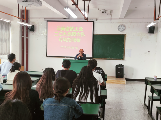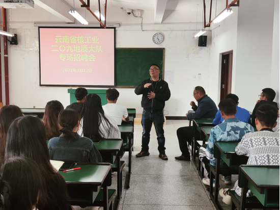 为深入贯彻党的二十大精神,落实《教育部办公厅关于开展2023届高校毕业生春季促就业攻坚行动的通知》精神,学院抢抓3月就业黄金窗口期,更好地为用人单位和毕业生搭建双向选择平台,促进毕业生更高质量更充分就业,2023年3月17日下午,伟德官方网站在载物楼903举办云南省核工业二〇九地质大队专场招聘会,云南省核工业二〇九地质大队研究院经理瞿亮带队到公司招聘优秀员工。