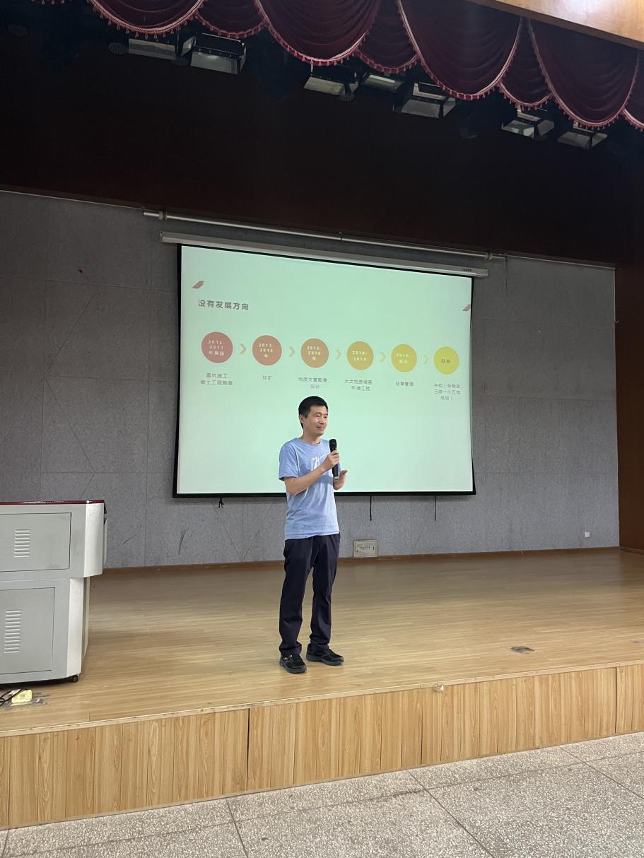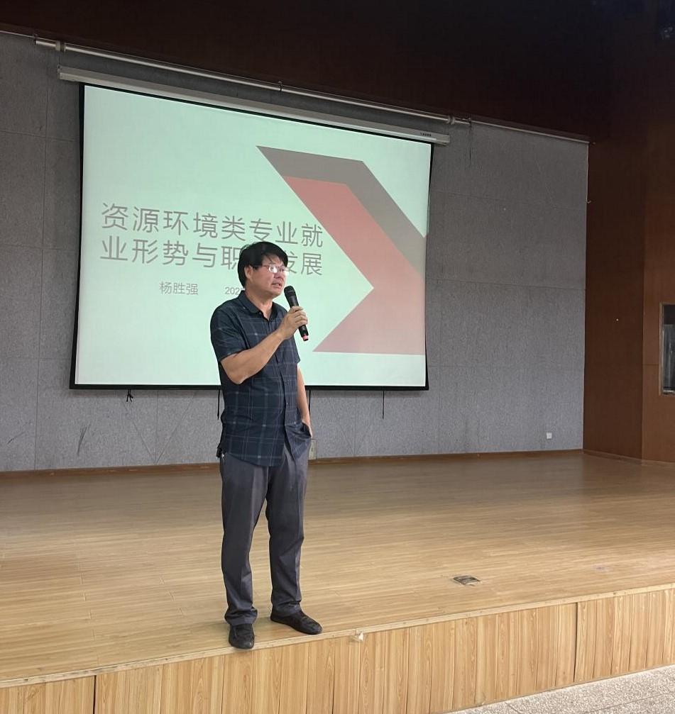 接着,杨胜强老师结合自身的成长和工作经历分享经验及心得,也介绍了许多我们学院之前毕业的优秀院友,总结了他们吃苦耐劳、勤奋努力、爱岗敬业的共性,在职场中始终秉持我们学校“明德尚能,学以致用”的校训精神。然后从资源环境类专业员工就业范围、就业后出现的困惑以及职场中生存需要哪些素质等方面进行讲解。杨胜强老师强调成长平台对大家职业生涯的重要性,引导大家转变就业观念,敢于将自己下沉到基层。在职场中做到勇于思考、善于提问和勤于行动,不断学习、提升自己的能力和素质,以便更好地适应职业发展和市场需求,传承和发扬我们地质人“三光荣”、“四特别”的传统精神。
