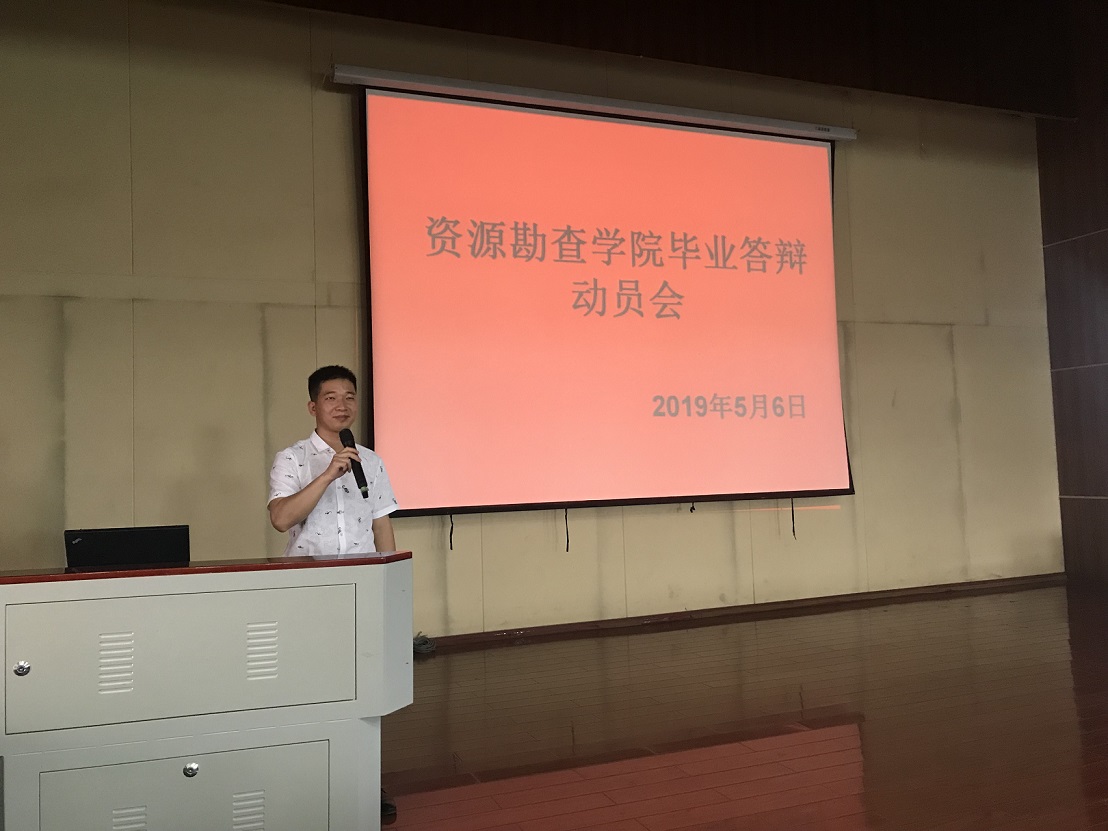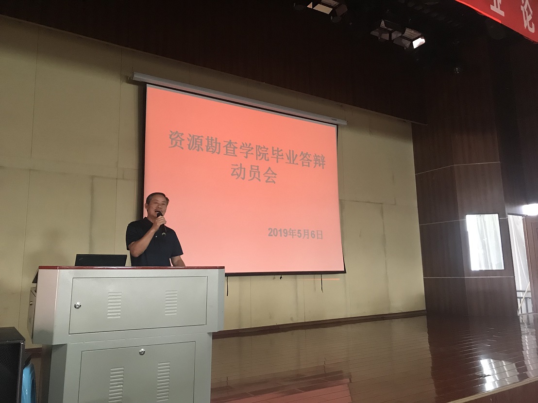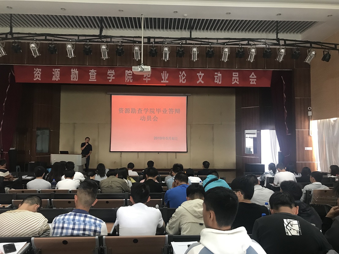 为了帮助同学们更全面地撰写毕业论文的意义和答辩的重要性,资源勘查学院于2019年5月6日上午10:00,在光荣讲堂召开了2019届毕业生论文答辩动员会。参加本次动员会的有,资源勘查学院经理左琼华老师、副经理李艳丽老师、办公室主任李瑾老师、实习实训办主任徐永全老师以及资源勘查学院郎学伟老师、王延发老师、黄开明老师、韩慎老师、唐刚老师、刘申张老师、杨砚喆老师等。