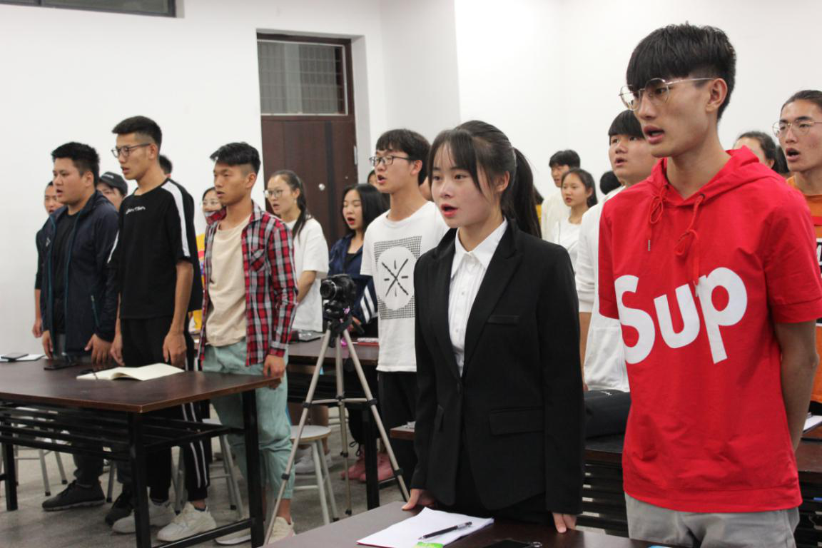会议共分为三项议程,由刘申张老师主持。会议第一项议程,全场起立,奏唱国歌。