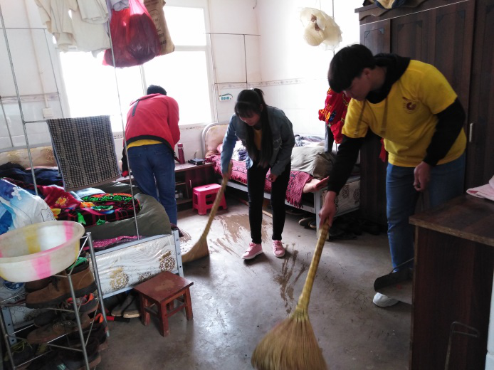 另一组在刘申张老师的带领下开始热火朝天的帮助老人打扫卫生、拖地、倒垃圾、擦窗户、抹瓷砖和整理床铺等,大家忙的不亦乐乎。经过半个多小时打扫,院子和房间内变得干干净净。