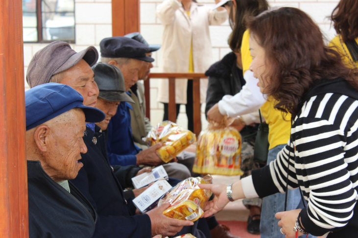 14点到达敬老院后,我们的志愿者分成两组,一组在李倩老师的带领下为老人们分发牛奶、毛巾、面包等慰问品,陪老人们聊天,了解他们的生活情况,气氛十分温馨、融洽。