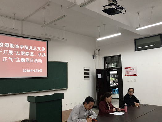 为积极响应中共中央、国务院对扫黑除恶专项斗争的总体部署,提高广大党员对扫黑除恶专项斗争的知晓率和参与度,进一步加深全体党员对扫黑除恶专项斗争精神的领会和理解,扎实推进扫黑除恶各项工作扎实开展。2019年4月9日资源勘查公司党总支结合主题党日活动,组织全体党员在勘物楼A409室认真学习了作为一名共产党员对扫黑除恶专项斗争应知应会知识的学习。