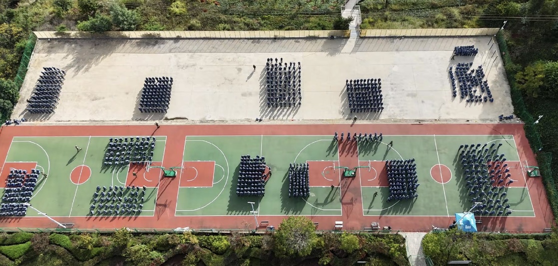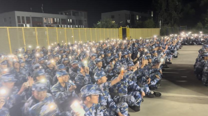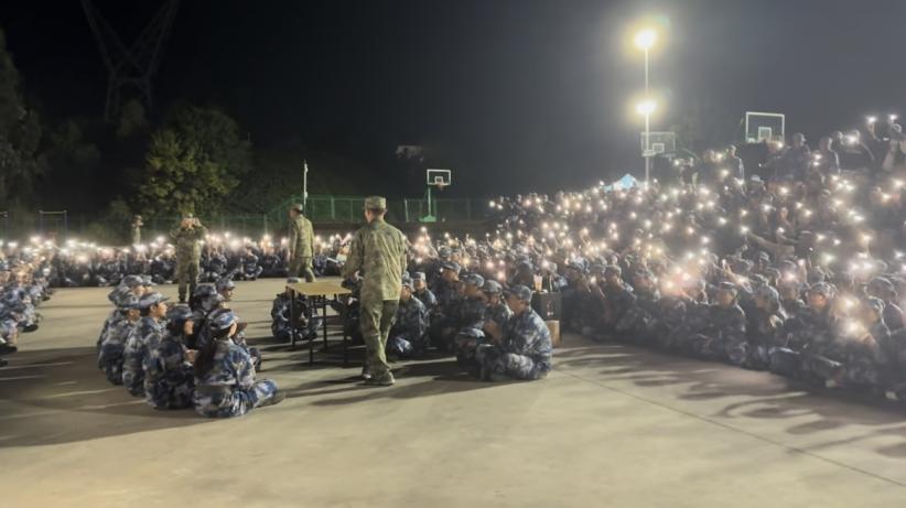 夜晚的训练结束,同学们打开手机手电筒,仿佛夜空中的星星在操场上汇聚成一片光的海洋,大家唱响胜利的赞歌,歌声在夜空中回荡,激昂的旋律驱散了疲惫,点燃了每个人的激情。