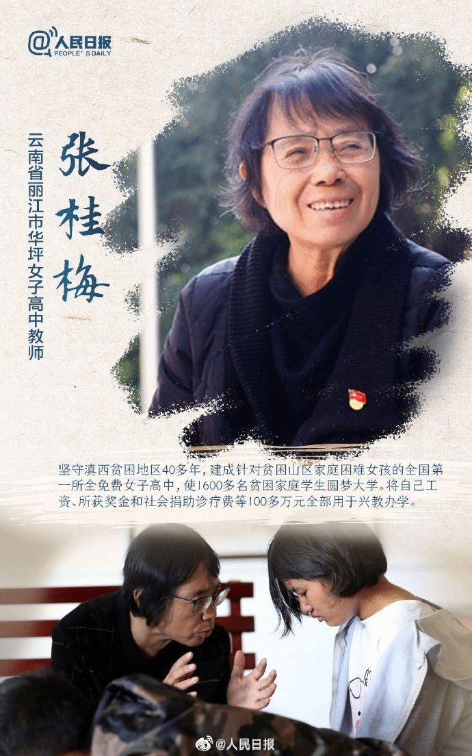 张桂梅现任云南省丽江市华坪县女子高级中学党支部书记、董事长,华坪县儿童福利院经理。她默默耕耘、无私奉献,扎根边疆教育40余年,推动创建了中国第一所免费女子高中,2008年建校以来已帮助1800多名女孩走出大山走进大学,用知识改变贫困山区女孩命运,用教育阻断贫困代际传递;她教书育人、立德树人,引导员工从小树立远大志向,倡导女性自尊自信自立自强,注重言传身教,传承红色基因,让“感恩党、听党话、跟党走”成为广老员工自觉追求;她无私纯粹,甘当人梯,一生保持清贫本色,疾病缠身依然奉献不止,用爱心和智慧点亮万千乡村孩子的人生梦想,展现了当代人民教师的高尚师德和责任担当。张桂梅曾先后获得“全国优秀教师”“全国三八红旗手”“云岭楷模”“全国教书育人楷模”“全国优秀共产党员”等称号。