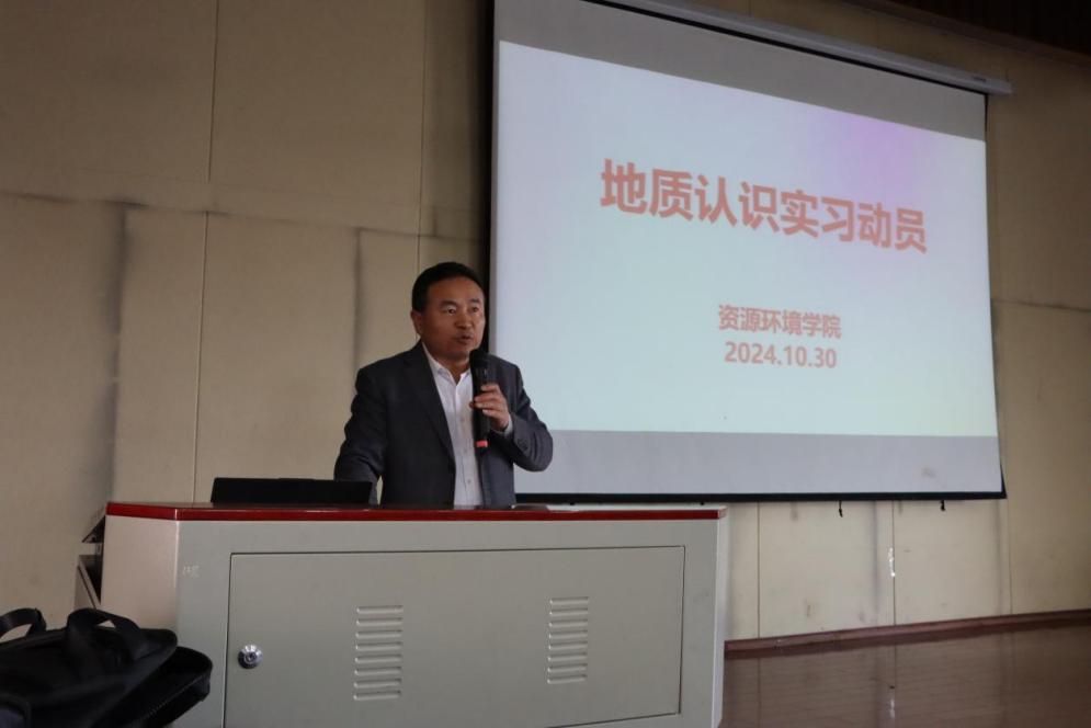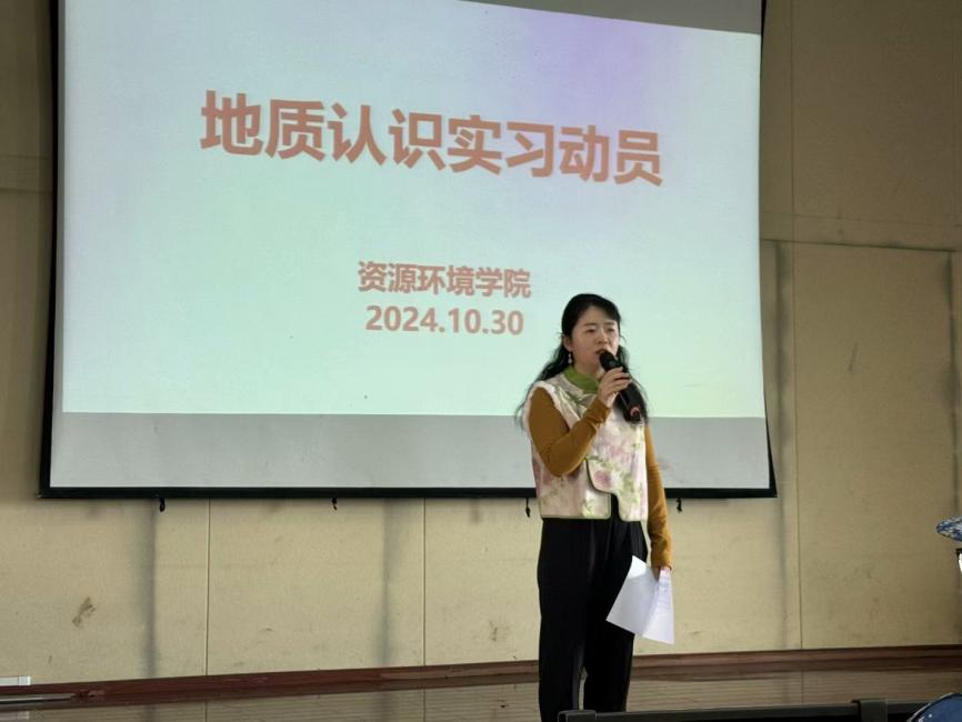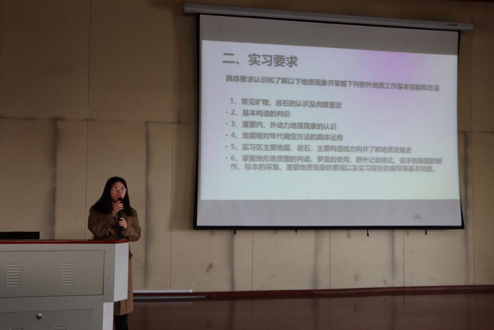 地调专业群教研室主任应玺老师,分别从地质认识实习的行程、时间安排、内容、实训报告编写要求以及外出需自行携带的物资等方面为同学们详细介绍,让同学们对实习流程有了清晰的认识;并且鼓励同学们要把实习内容与课堂知识结合起来,更好的学习专业相关课程。