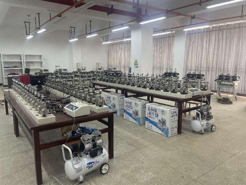 土工实验室位于载物楼201,202,203,配备有数码点荷载仪、携带式剪切仪、应变控制式直剪仪、全自动应变控制三轴仪、三联式单杠固结仪、手动土壤最小孔隙比仪、变水头渗透仪、数显液塑限测定仪等共计114台(套),设备价值188万余元,可以开展土的密度实验、含水率实验、比重实验、颗粒分析实验、液塑限实验、固结实验、剪切实验、三轴实验、击实实验等。