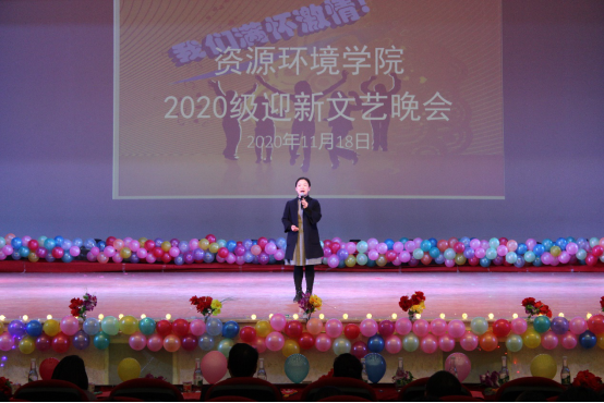 晚会在全体合唱国歌《义勇军进行曲》中拉开帷幕。公司党总支书记李倩老师上台致辞,她代表学院对到场的领导嘉宾表示感谢,对2020级704位新生的到来表示欢迎,李老师说:“你们的到来为资环这个大家庭注入勃勃生机,祝愿你们能在接下来的学习生涯中学有所成,最后预祝晚会圆满成功。”