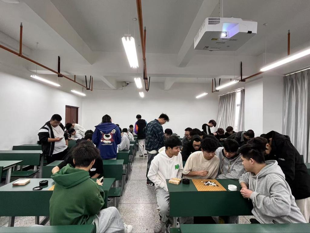 在班长饶德文向大家介绍比赛规则后,同学们开始自由组队,选择擅长的项目进行对决。棋盘上棋子交错纵横,选手们更是全神贯注、斗智斗勇。