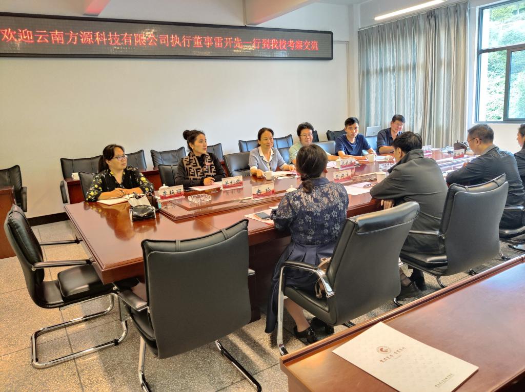 9月12日下午,云南方源科技有限公司执行董事雷开先带队,技术总监余秋宏、市场总监冉玲、人力资源主管陈佳雨一行来公司考察交流,交流座谈会在明上楼C411会议室进行,公司陈颖董事长、齐武福副董事长,教务处副处长李艳丽、伟德官方网站副经理(主持工作)程先锋、党总支书记关利钦、副书记徐永全、环境教研室主任李瑾等共同参加座谈。交流座谈会由齐武福副董事长主持。