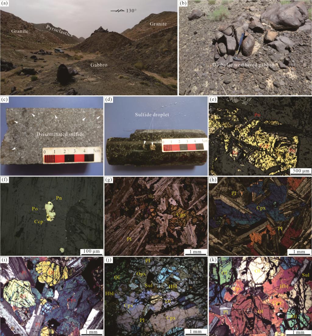 论文选择哈尔克岛弧带南缘早二叠世三宫镁铁-超镁铁质岩体进行详细解剖,开展岩相学、矿物学、岩石地球化学和铂族元素(PGE)研究。研究发现三宫镁铁-超镁铁质岩体是一个分异较强的杂岩体,由淡色辉长岩、辉长岩、橄榄辉长岩、含斜长石橄榄岩和含斜长石辉石岩组成,其中含斜长石辉石岩发育浸染状硫化物(图2)。各类岩石相对富集轻稀土元素(LREE)、大离子亲石元素(LILE)和钯族铂族元素(PPGE),而亏损高场强元素(HFSE)和铱族铂族元素(IPGE),表明原始岩浆来源于亏损地幔源区并受到俯冲板片流体的交代,母岩浆为玄武质岩浆且演化程度较高。岩石中亲硫元素含量指示岩浆受到地壳S的混染并发生了硫化物饱和熔离(图3)。再者,三宫岩体橄榄石Fo值普遍较低(<78.7 mol%),对比区域成矿岩体特征推测其深部可能存在含矿的超基性岩体。