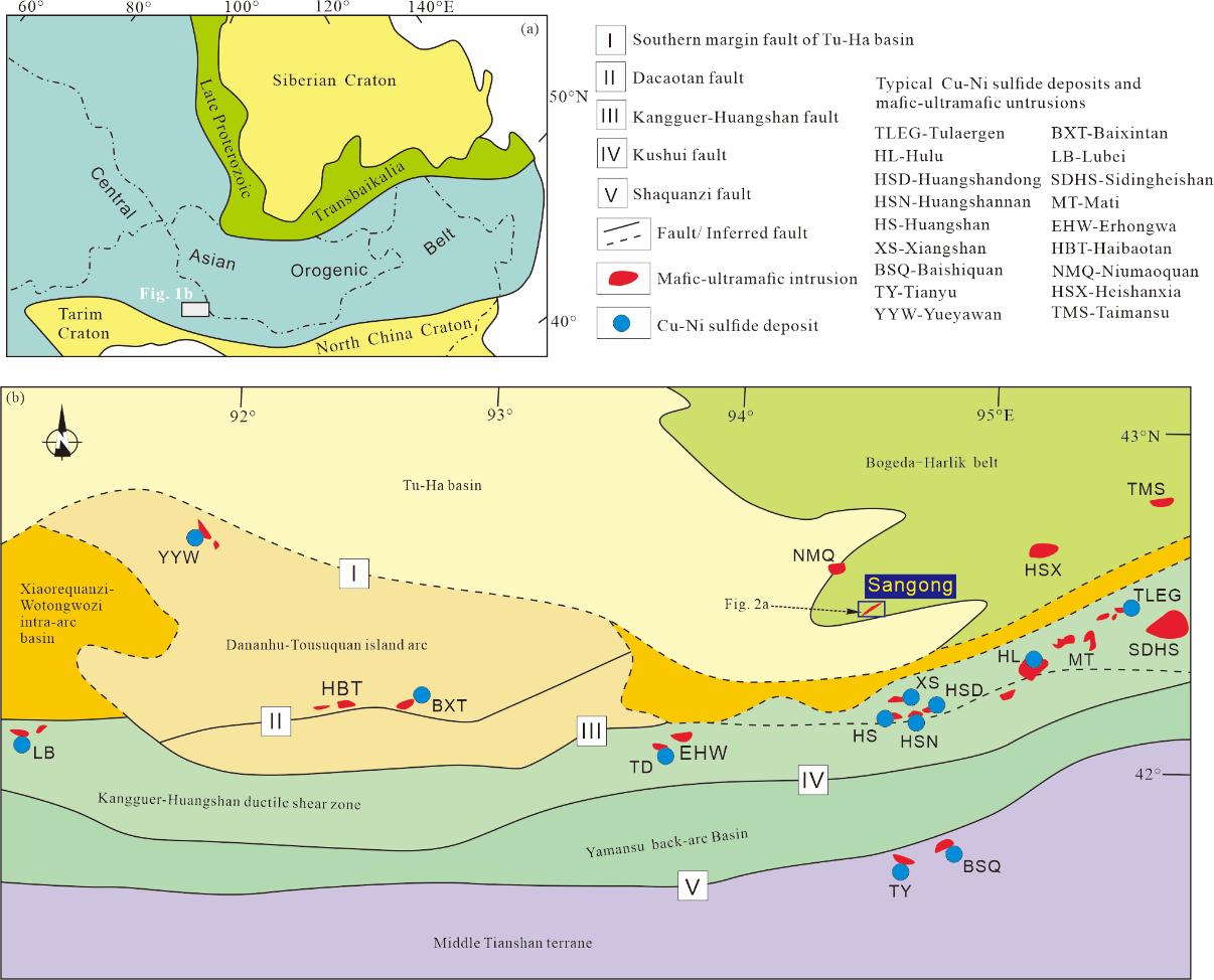 图1 (a)中亚造山带构造位置图和(b)东天山构造格架及镁铁-超镁铁质岩体分布图
