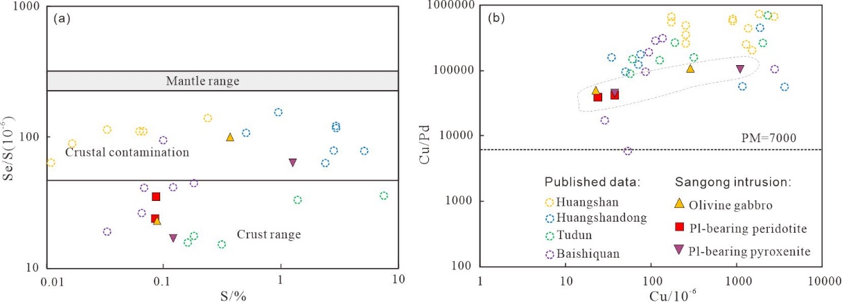 图3 三宫岩体S-Se/S和Cu-Cu/Pd图解